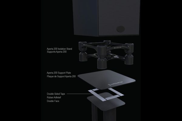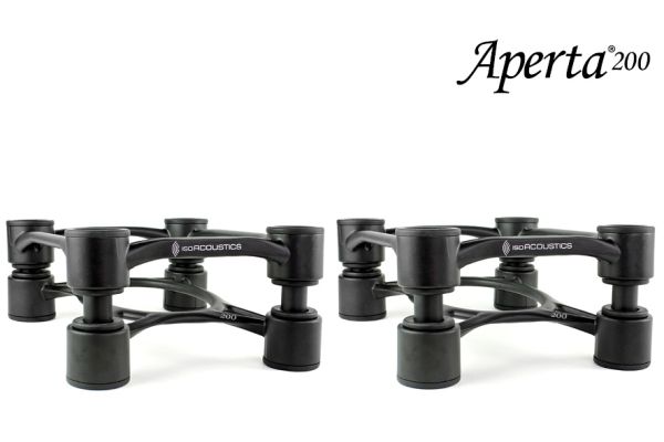 Aperta 200 bilden ein Stativ-System für größere Kompaktlautsprecher mit einem Gewicht von maximal 34 Kilogramm. Sie sind in schwarz oder silber lieferbar und lassen sich in der Neigung um +/- 6,5° verstellen. Somit kann der Hochtöner direkter auf das Ohr gerichtet werden. Sie sind ideal auf mitschwingenden Oberflächen und verbessern den Klang jedes Kompaktlautsprechers, egal ob passiv oder aktiv angesteuert. Die Elastomer-Dämpfer haben einen Saugnapf-Effekt, um sowohl den Lautsprecher gut zu halten als auch um selbst stabil zu stehen.